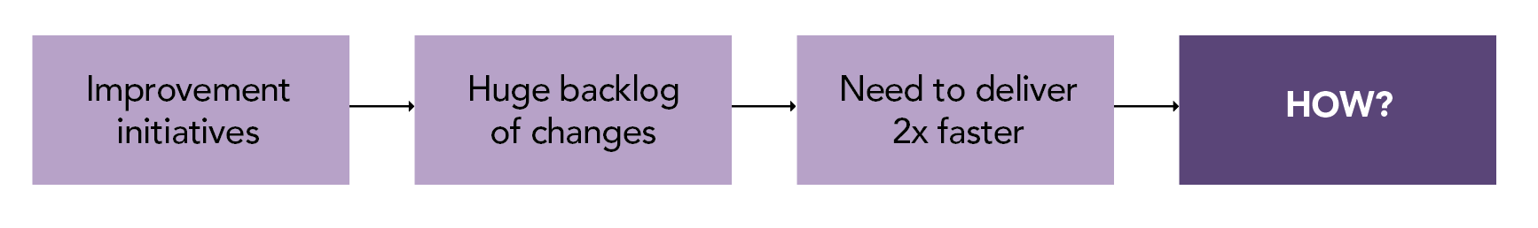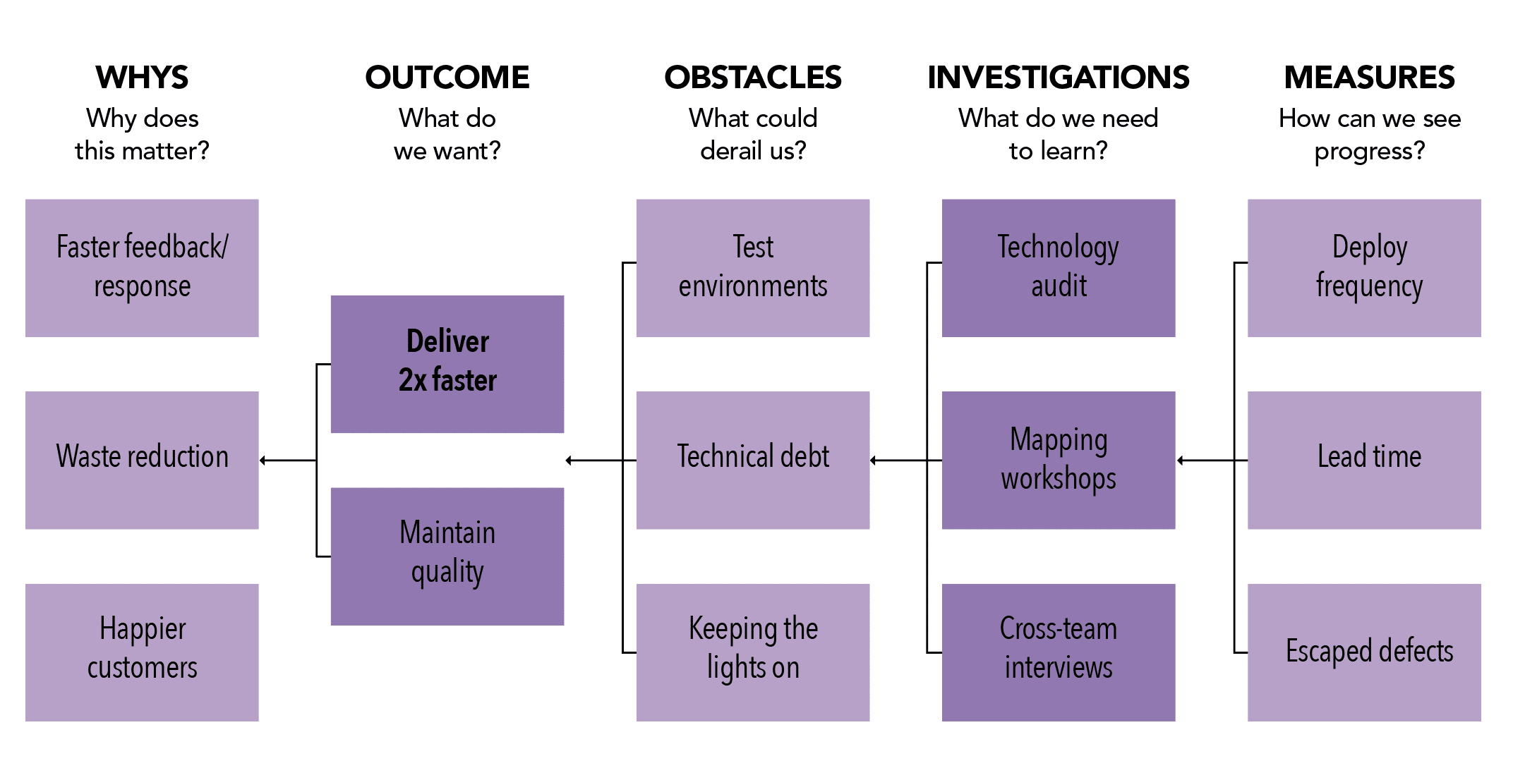 A powerful approach to start this process is to begin with the end in mind. Consider Sharon’s target outcome, “Release twice as fast.” What does Sharon need to do to get there? Starting from that point, let’s, as facilitators, guide Sharon’s team through breaking down what “twice as fast” actually looks like and what stands between the team and the outcome.