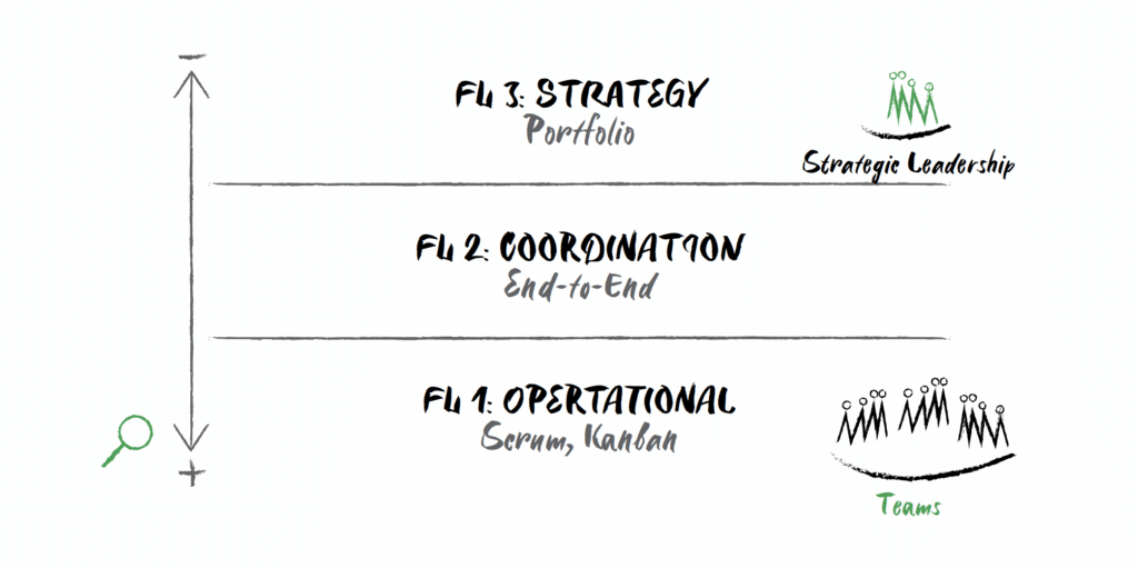 Flight Level 2 coordination ensures that the project or product increment gets done, but the organization is more than just one project. This is particularly true for service organizations that implement many projects for many customers. The success of a service organization rarely depends on a single project. Rather, it results from a complex interplay of business goals, strategy, consulting skills, client organizations, partnerships, technical capabilities, hiring, and retention. Focusing on single projects will undoubtedly help those projects end successfully. Still, in the grand scheme of things, it can harm the organization if we’re not carefully balancing the above mentioned factors. That’s where Flight Level 3 jumps in.