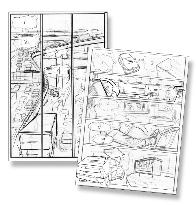 With the script in hand, we moved on to bringing the characters and world of Parts Unlimited to life visually. This stage involved choosing an illustration style, creating detailed character sketches, and developing rough panel sketches for each page.