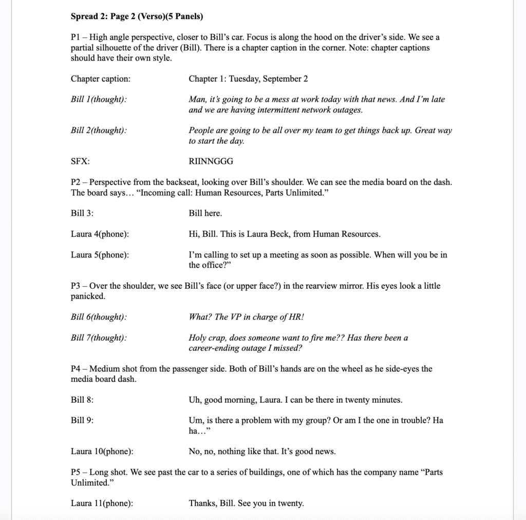 Initially, we started with a DC-style script, which provided explicit directions for each panel. See below: