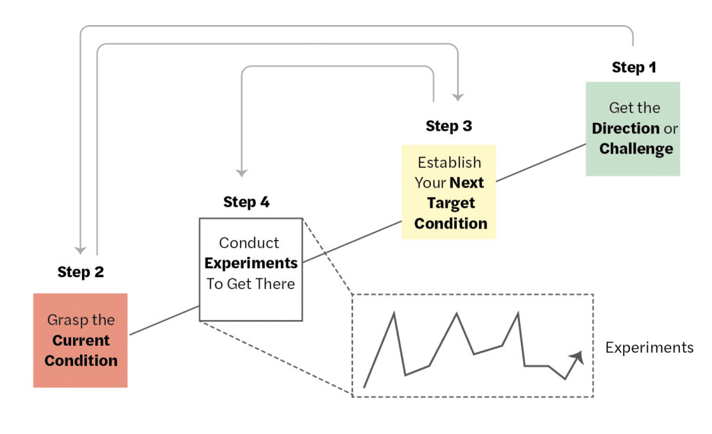 The Improvement Kata is a four-step pattern of establishing a target condition, grasping the current condition, establishing the next target, and iteratively working toward that target. The Improvement Kata itself is a cybernetic loop, focused on continuous adjustment while navigating toward a target goal.