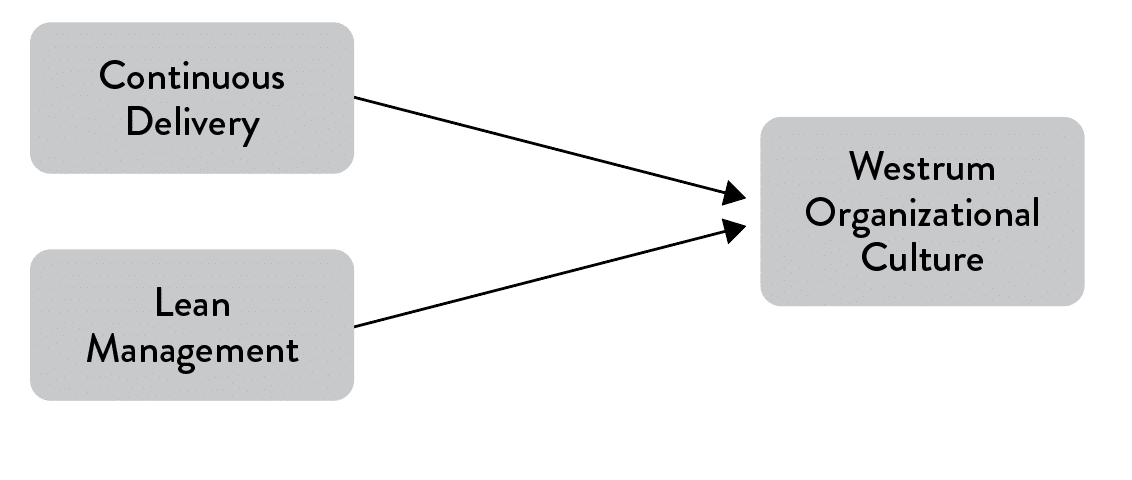 Thus we hypothesize that, following the theory developed by the Lean and Agile movements, implementing the practices of these movements can have an effect on culture. We set out to look at both technical and management practices, and to measure their impact on culture. Our research shows that Lean management, along with a set of other technical practices known collectively as continuous delivery, do in fact impact culture, as shown below.